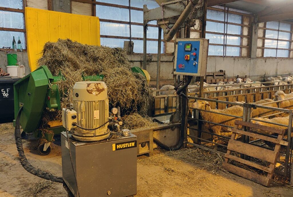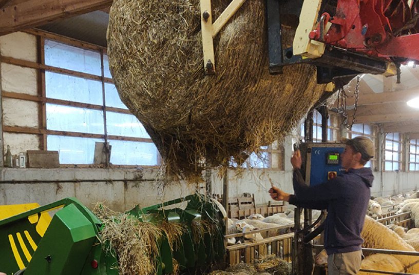 David Barban farms sheep in the French Alps. During winter, his ewes are housed indoor and David invested in a Hustler stationary Chainless bale feeder SX105 to unwind his bales into feed conveyors, making him able to do the job all by himself quickly and efficiently.