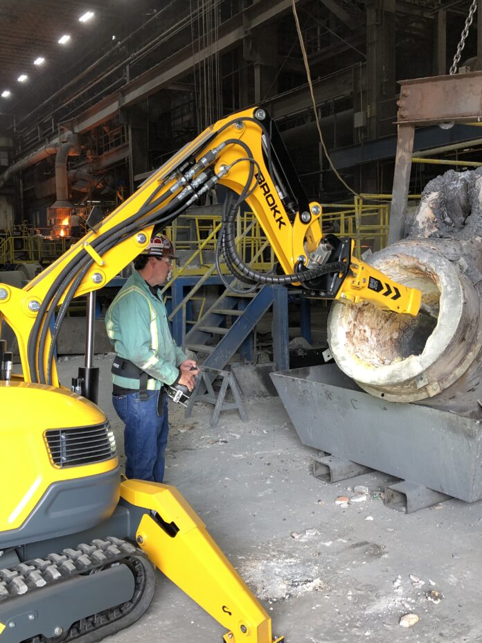 Brokk has developed a number of heat-resistant options, including cylinder protection, steel tracks, and a forced draft cooling system. These features are available on most Brokk models, including the Brokk 800P, the manufacturer’s 11-ton, specialized processing machine, and can also be added to smaller units, such as the versatile, 1-ton Brokk 110 for hot applications in tight spaces. When combined with remote operation, heat-resistant features allow facilities to begin maintenance operations, such as ladle cleaning and refractory removal, while temperatures are still too high for workers to approach, increasing productivity and safety for these vital tasks.