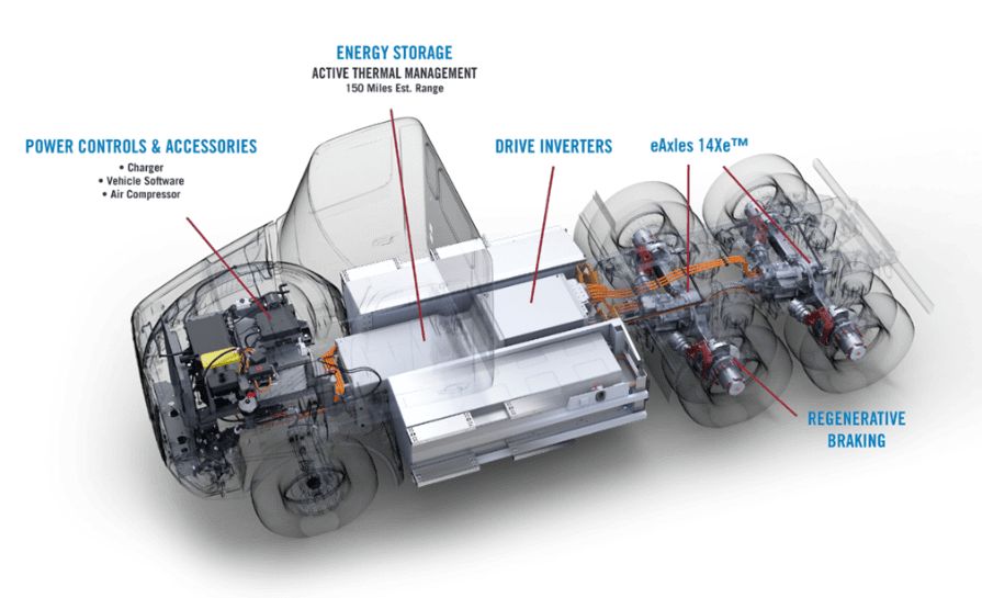 The Model 579EV is available in a tandem drive configuration with Meritor 14Xe e-axle motors providing power through the drive inverters. Regenerative braking captures energy from stop-and-go operations to help recharge the batteries and maximize the vehicle’s range.
