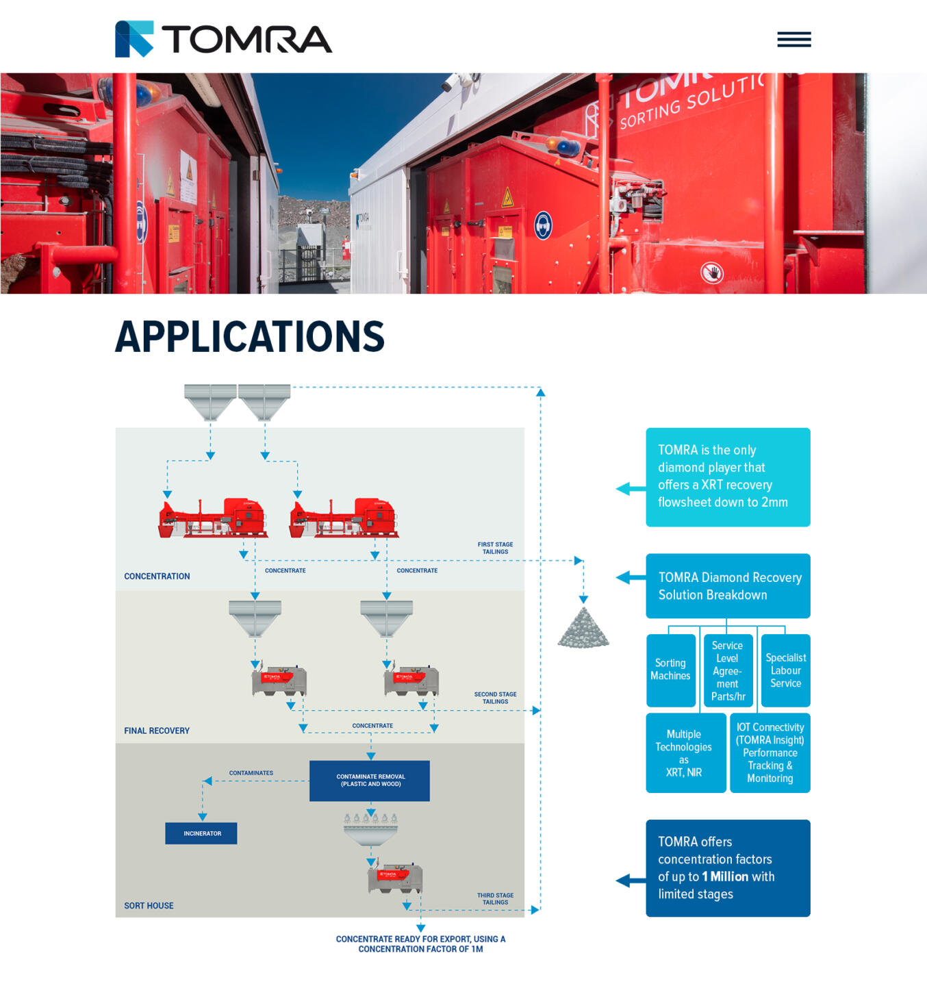 With the new introduction, TOMRA is the first company in the industry able to supply a full diamond recovery solution using X-Ray Transmission (XRT) technology from 2mm to 100mm, coupled with all the benefits of cloud computing for monitoring and managing the entire process.