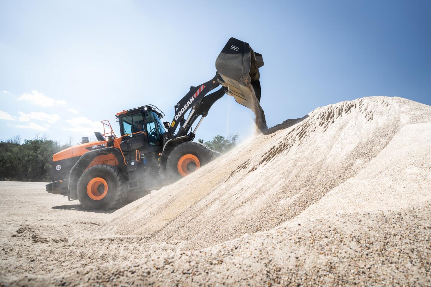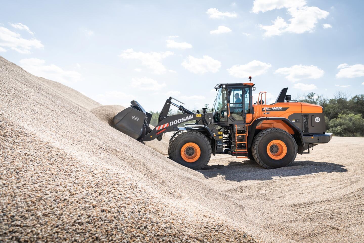 The Z-kinematic lift arm on the DL420CVT-7 delivers high breakout forces and lifting capacities, especially for heavy materials, and a large dump angle for efficiently unloading sticky materials. An optional high lift arm is available where higher dump heights and increased versatility are required. Doosan is also offering a wider choice of options to provide more work tools for a better match with applications, further increasing output.
