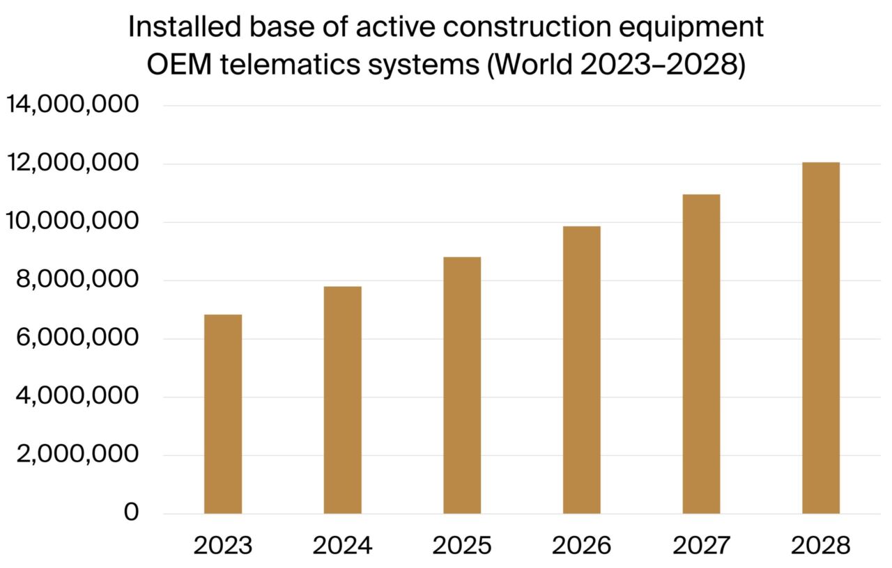 “OEM telematics systems are today commonly factory-installed as standard at least for heavier machines and increasingly also for compact equipment. Caterpillar, which is also by far the leading construction equipment manufacturer by market share, has well over 1 million connected assets in the construction equipment segment specifically.”