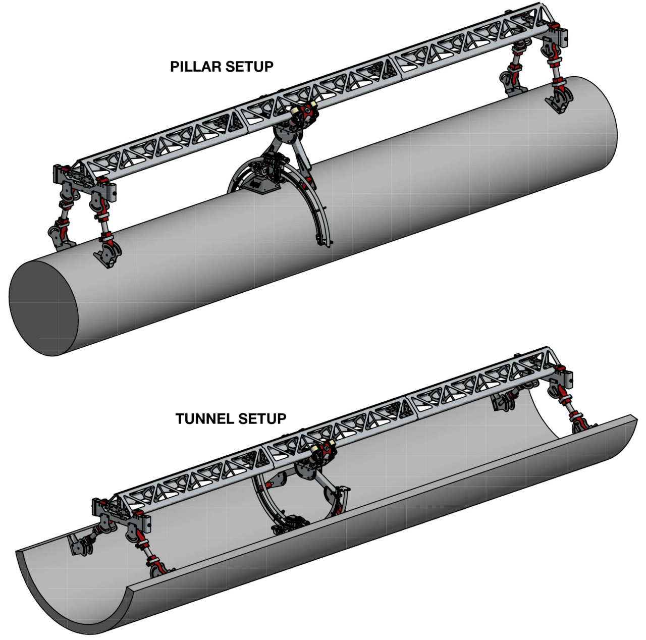 The Aqua Spine 3.0 is compatible with the Circular Power Head and Aqua Centralizer, a ring mounted to the Aqua Spine base used for work on pipes or inside tunnels. The curved roller beam is compatible with both the Climber and Spine system and can be easily constructed into a complete circle. All parts of the Spine system are assembled with M16 or M20 bolts, allowing contractors to easily assemble and adjust with few tools.
