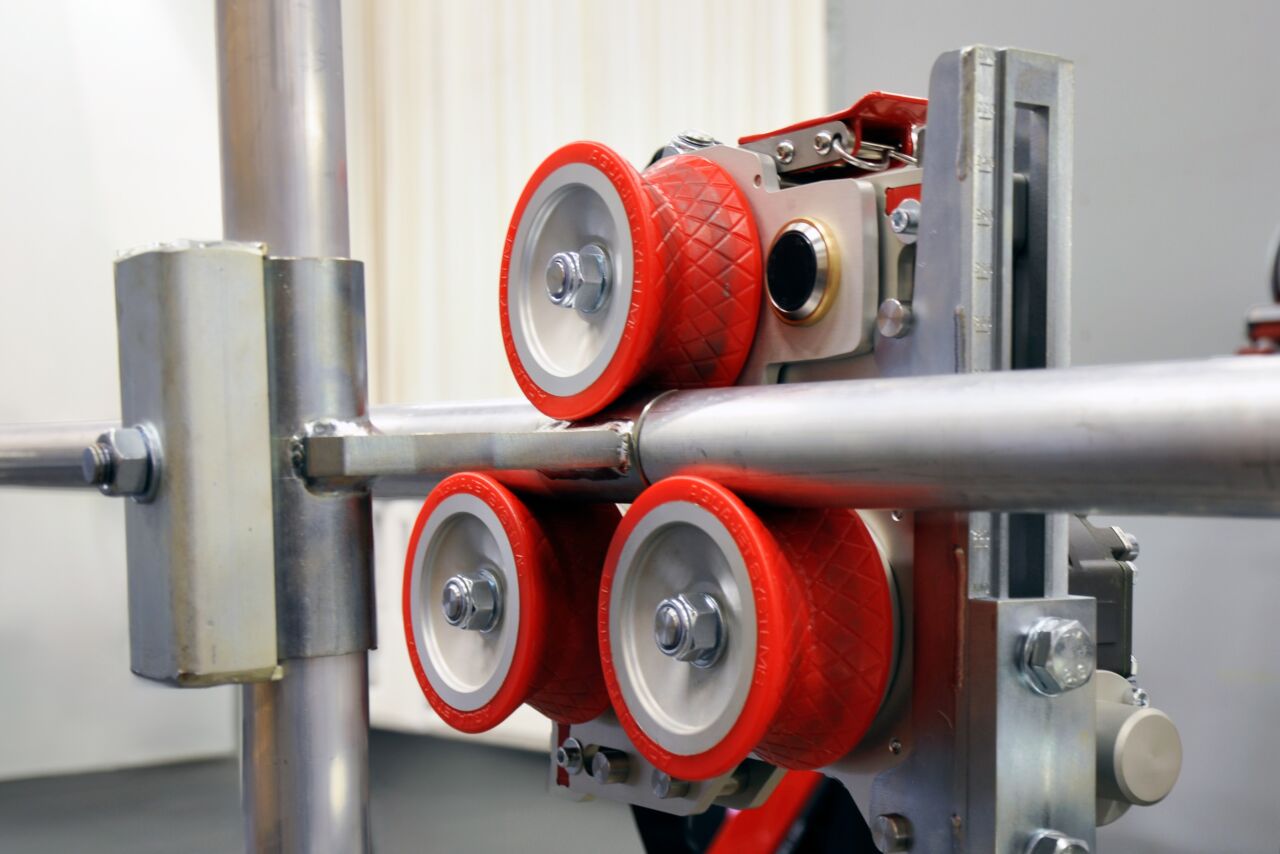 The updated Ergo Climber 3.0 features several improvements, such as beam brackets with adjustable height and angle, adjustable clamping screws allowing it to attach and move along both standard and curved scaffolding pipes or roller beams and be configured as a complete circle for pillars and pipes. New passable brackets enable the Climbers to move the Ergo Power Head continuously along the scaffolding, making it possible to build infinitely long racks and increasing productivity without the need to stop and reposition.