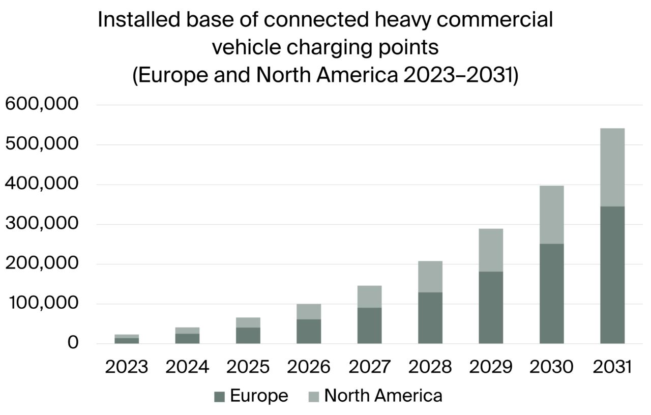 Berg Insight has released new findings about the market for heavy electric commercial vehicle charging infrastructure in Europe and North America. The total number of connected charging points in Europe is forecasted to grow at a compound annual growth rate (CAGR) of 49 percent from 14,000 in 2023 to 345,000 by the end of 2031. In North America, the total number of connected charging points will increase from 9,000 in 2023 to reach 196,000 by 2031, growing at a CAGR of 47 percent.